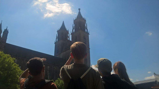 Da niemand der Beteiligten „Fluchtpunkt Magdeburg“ einfach aufgeben wollte, entschlossen wir uns als Gruppenleitung dazu, unsere Arbeit zunächst ehrenamtlich fortzusetzen. Auch mit unserer diesjährigen Produktion „Morgenland“ wurden wir zum „STT“ eingeladen. In diesem Stück unternahmen wir eine Zeitreise in die Zukunft: Um die Abschiebung eines Ensemblemitgliedes zu verhindern, flüchtet die Gruppe mit Hilfe einer selbstgebauten Zeitmaschine in die Zukunft. Allerdings stolpert man von einer dystopischen Katastrophe in die nächste. Diktaturen, Zerstörung durch Umweltverschmutzung und Klimawandel, Kriegen und der Herrschaft von Maschinen muss das Ensemble entkommen um endlich, hundert Jahre später, in einer Gesellschaft zu landen, die perfekt ist. Allerdings entscheidet sich der von Abschiebung bedrohte Abdo dazu, zurück in die Ausgangszeit zu reisen, weil seine Freundin dort auf ihn wartet. Nach kurzer Diskussion beschließt das restliche Ensemble auch zurück zu gehen, um die Katastrophen, die man während der Reise gesehen hat, zu verhindern. „Daheim“ angekommen, stellt sich heraus, dass Abdo nicht mehr abgeschoben werden soll. Einem kurzen Jubel folgt Ernüchterung.... Abdo: Aber warum werde ich nicht abgeschoben? Muayad: Deine Heimat ist nicht sicher. Eben dieser Muayad war nach dem letzten Schülertheatertreffen (STT) im September 2017 zu seinem Bruder nach Wismar gezogen. Als er von unserer erneuten Teilnahme am STT erfuhr, fragte er sofort, ob es nicht eine Möglichkeit für ihn gäbe, dabei zu sein. Also beschlossen wir, ihn in das Stück einzubauen. Das bedeutete allerdings, dass wir erst einen Tag vor Beginn des STT die Möglichkeit hatten, mit allen Akteuren gemeinsam zu arbeiten. Doch es gelang dem Ensemble in beeindruckender Art und Weise zur Eröffnung des „26.Schülertheatertreffens des Landes Sachsen-Anhalt“ das Publikum zu erreichen, zum Lachen zu bringen und zu berühren. Die „Botschaft“ unserer gemeinsamen Arbeit spiegelt sich vielleicht in einem Monolog wieder, der kurz vor Ende von „Morgenland“ dreisprachig (arabisch/deutsch/englisch) vorgetragen und mit langanhaltendem Szenenapplaus bedacht wurde: früher gab es Länder früher gab es Länder, die waren ummauert, damit man nicht rauskam früher gab es Länder, die waren ummauert, damit man nicht reinkam früher gab es Länder, in denen durfte man nicht sagen, was man denkt früher gab es Länder, in denen durfte man nicht glauben, was man glaubt früher gab es Länder, in denen durfte man nicht lieben, wen man liebt früher gab es Länder, in denen durfte man nicht lieben, wie man liebt früher gab es Länder, die musste man verlassen, weil man ohne Zukunft war früher gab es Länder, die haben gegeneinander Krieg geführt früher gab es Länder, die haben Krieg geführt, gegen sich selbst früher gab es Länder, in denen sind Kinder verhungert früher gab es Länder, in denen haben sich Menschen totgeschlagen, weil ihre Götter verschiedene Namen trugen früher gab es Länder, in denen haben Menschen sich und andere in die Luft gesprengt, weil sie voller Hass und ohne Hoffnung waren früher gab es Länder heute sind wir Menschen